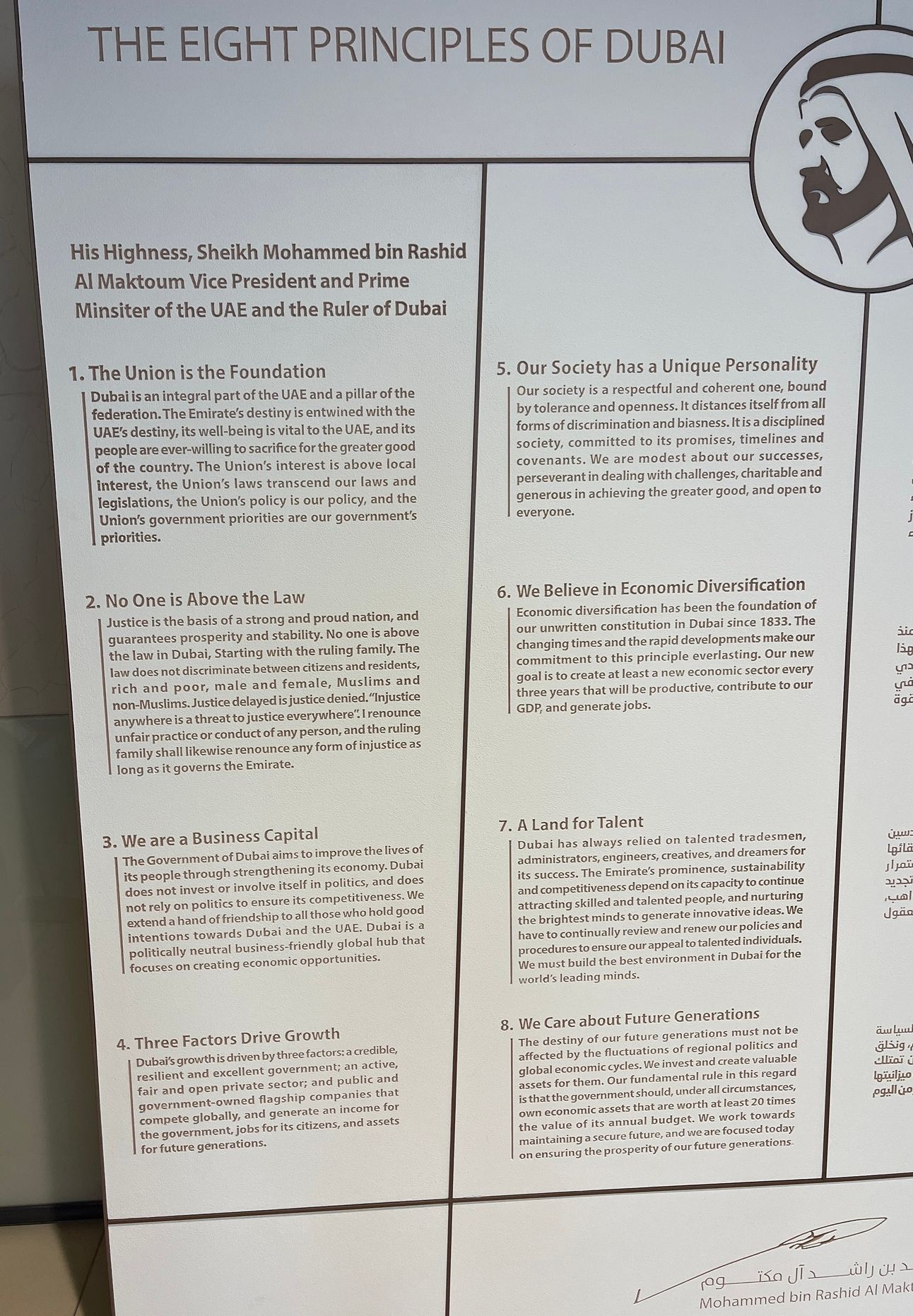 As you wander through the city and airport, you'll notice posters displaying the 8 Principles of Dubai everywhere you go. I took a picture and added it below.